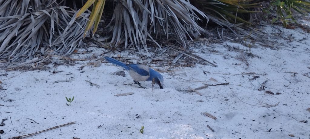 Florida Scrub Jays rarely travel farther than one mile from where they hatched. They have evolved to master a small area of territory and defend it fiercely. Most birds migrate or live otherwise nomadic lifestyles. The Scrub Jay only leaves a home territory in cases of natural disaster or the occasional bird that decides an area is too congested with other Jays. That bird will seek out other areas hoping to find a place to call its own or even link up with other groups. I call them “squirters” in that they feel squeezed out and “squirt” to another location. This is probably built into their DNA for species survival so that genetic bottlenecking doesn’t occur.